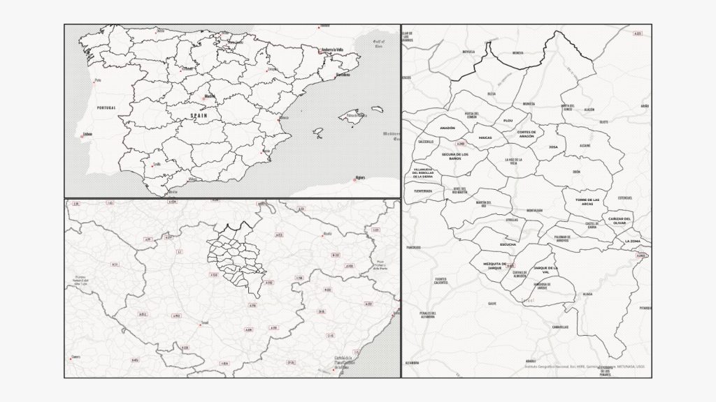 Municipios: Alcaine, Aliaga, Anadón, Blesa, Cañizar del olivar, Castel de Cabra, Cortes de Aragón, Cuevas de Almudén, Escucha, Fuenferrada, Hinojosa de Jarque, Huesa del Común, Jarque de la Val, Josa, La Hoz de la Vieja, La Zoma, Maicas, Martín del Río, Mezquita de Jarque, Montalbán, Muniesa, Obón, Palomar de Arroyos, Plou, Salcedillo, Segura de Baños, Torre de las Arcas, Utrillas, Villanueva del Rebollar de la Sierra, Vivel del Río Martín